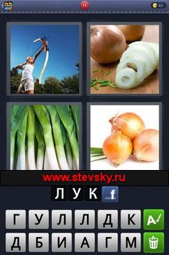 4 фотки 1 слово ответы уровень 011: 1. Девушка стреляет из лука 2. Порезанный кольцами лук 3. Зелёные стебли 4. Три луковицы 3 буквы Правильный ответ - ЛУК |