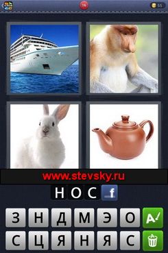 4 фотки 1 слово ответы уровень 016: 1. Корабль, паром, круизный лайнер 2. Редкая обезьяна 3. Кролик 4. Коричневый чайник 3 буквы Правильный ответ - НОС |