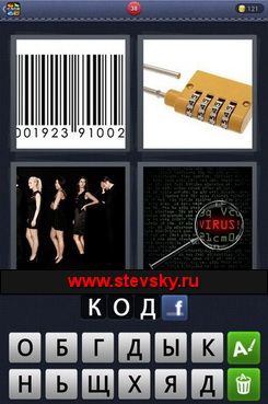4 фотки 1 слово ответы уровень 038: 1. Штрих-код 2. Замок 3. Очередь в клуб 4. Лупа, увеличившая слово VIRUS 3 буквы Правильный ответ - КОД |