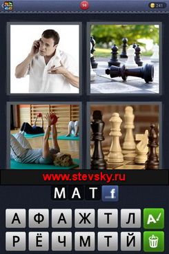 4 фотки 1 слово ответы уровень 098: 1. Лобанов говорит по телефону 2. Шахматы, партия закончена поражением чёрных 3. Занятия йогой 4. Снова шахматы 3 буквы Правильный ответ - МАТ |