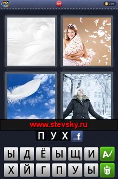 4 фотки 1 слово ответы уровень 104: 1. Белые узоры 2. Девушка разорвала подушку 3. Перышко на фоне неба 4. Девушка зимой на улице 3 буквы Правильный ответ - ПУХ |