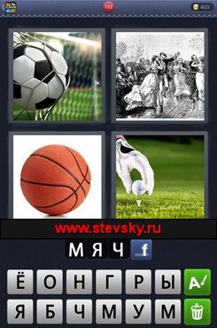 4 фотки 1 слово ответы уровень 150: 1. Футбольный мяч в сетке ворот 2. Черно-белая картина: бал, люди танцуют 3. Баскетбольный мяч 4. Рука ставит шарик для гольфа на подставку 3 буквы Правильный ответ - МЯЧ |