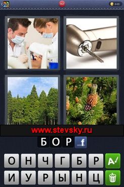 4 фотки 1 слово ответы уровень 165: 1. Стоматологический кабинет 2. Стоматологический инструмент для сверления зубов 3. Хвойный лес 4. Шишка на ветке 3 буквы Правильный ответ - БОР |