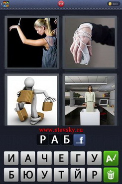 4 фотки 1 слово ответы уровень 241: 1. Девушка привязана верёвками за руки 2. Рука, оплетенная проводом от компьютерной мышки 3. Нарисованный человечек с замками на руке, ногах и шее 4. Девушка стоит в белой коробке 3 буквы Правильный ответ - РАБ |