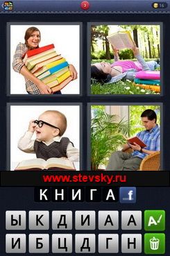 4 фото 1 слово ответы уровень 003: 1. Девушка с книгами 2. Девушка лежит на траве 3. Мальчик в очках 4. Мужчина в кресле 5 букв Правильный ответ - КНИГА |