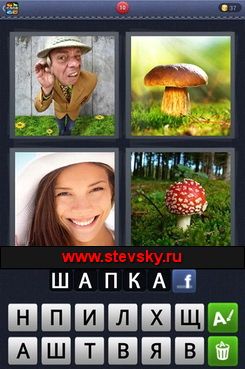 4 фото 1 слово ответы уровень 010: 1. Мужчина приложил руку к уху 2. Белый гриб 3. Девушка улыбается 4. Мухомор 5 букв Правильный ответ - ШАПКА (ШЛЯПА) |