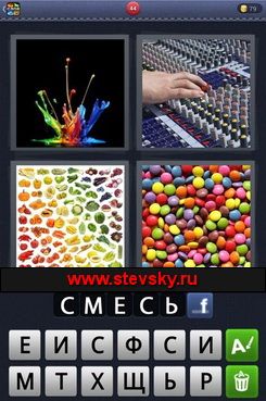 4 фото 1 слово ответы уровень 044: 1. Разноцветные брызги 2. Ассортимент косметики 3. Рахноцветные стёклышки 4. Разноцветные конфеты-драже 5 букв Правильный ответ - СМЕСЬ |