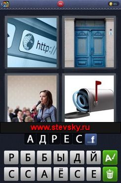 4 фото 1 слово ответы уровень 046: 1. http:// 2. Синие двери 3. Девушка с микрофоном 4. Почтовый ящик 5 букв Правильный ответ - АДРЕС |