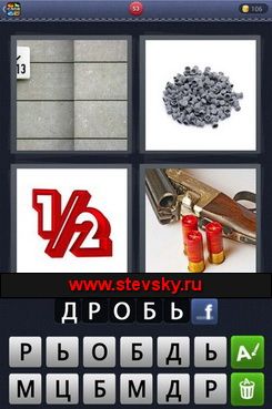 4 фото 1 слово ответы уровень 053: 1. Серая стена в полоску 2. Куча мелких серых деталек 3. 1/2 4. Патроны к ружью 5 букв Правильный ответ - ДРОБЬ |
