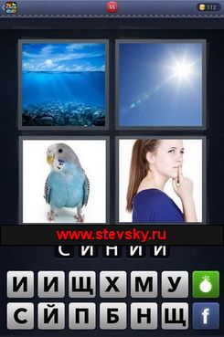 4 фото 1 слово ответы уровень 056: 1. Море 2. Солнце в небе 3. Попугай 4. Девушка задумалась 5 букв Правильный ответ - СИНИЙ |
