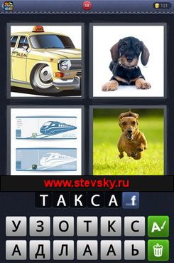 4 фото 1 слово ответы уровень 058: 1. Такси 2. Собака 3. Билет на поезд 4. Собака в прыжке 5 букв Правильный ответ - ТАКСА |
