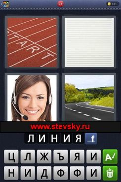 4 фото 1 слово ответы уровень 078: 1. Старт беговой дорожки, надпись START 2. Тетрадный лист в линейку 3. Девушка с телефонной гарнитурой, оператор колл-центра 4. Поворот дороги 5 букв Правильный ответ - ЛИНИЯ |