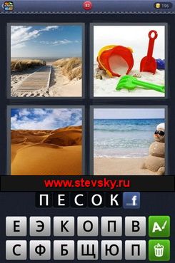 4 фото 1 слово ответы уровень 083: 1. Дорога к морю 2. Детские лопатки и формочки 3. Пустыня 4. Пляж 5 букв Правильный ответ - ПЕСОК |