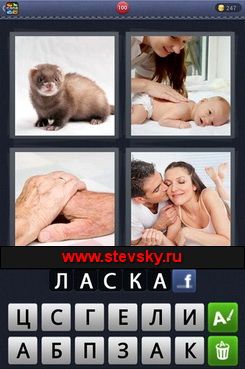 4 фото 1 слово ответы уровень 100: 1. Пушной зверёк 2. Мама гладит младенца по спинке 3. Старческие руки 4. Парень целует девушку 5 букв Правильный ответ - ЛАСКА |