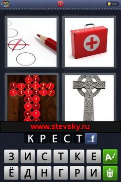 4 фото 1 слово ответы уровень 101: 1. Красный крестик в кружке 2. Чемоданчик скорой помощи 3. Свечи, выложенные крестом 4. Надгробный крест 5 букв Правильный ответ - КРЕСТ |