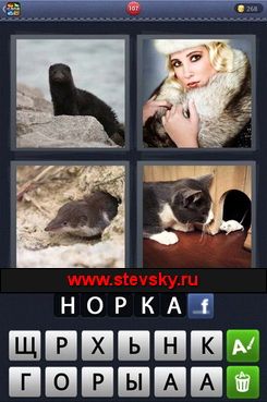 4 фото 1 слово ответы уровень 107: 1. Пушной зверёк 2. Девушка в меховой шубе 3. Птичка или зверёк 4. Кошка и мышка 5 букв Правильный ответ - НОРКА |