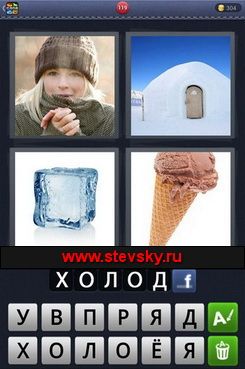 4 фото 1 слово ответы уровень 119: 1. Девушка в шапке 2. Дом из снега 3. Ледяной кубик 4. Мороженое вафельная трубочка 5 букв Правильный ответ - ХОЛОД |