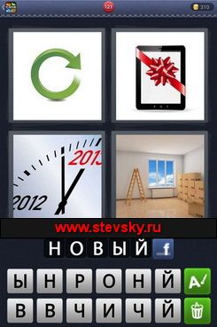 4 фото 1 слово ответы уровень 121: 1. Зелёная круговая стрелка 2. Планшет с подарочным бантиком 3. Часы, показывающие пять минут до нового 2013 года 4. Комната с белыми стенами и стремянкой посередине 5 букв Правильный ответ - НОВЫЙ |