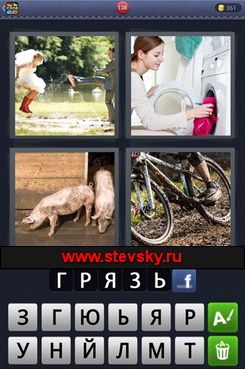 4 фото 1 слово ответы уровень 137: 1. Невеста прыгает в лужу 2. Девушка кладёт вещи в стиральную машину 3. Свиньи в хлеву 4. Велосипед едет по бездорожью 5 букв Правильный ответ - ГРЯЗЬ |