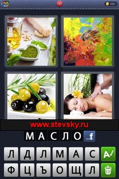4 фото 1 слово ответы уровень 145: 1. Ингридиенты для приготовления какого-то блюда 2. Картина, представляющая собой мешанину красок 3. Оливки чёрные и зелёные 4. Девушке делают массаж 5 букв Правильный ответ - МАСЛО |
