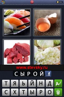 4 фото 1 слово ответы уровень 147: 1. Суши 2. Разбитое на две части яйцо, желток внутри 3. Куски мяса 4. Нашинкованная капуста 5 букв Правильный ответ - СЫРОЙ |