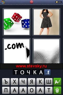 4 фото 1 слово ответы уровень 151: 1. Три разноцветных игральных кубика 2. Девушка в чёрном платье в белый горошек 3. .com 4. Узор из маленьких чёрных квадратиков на белом фоне 5 букв Правильный ответ - ТОЧКА |