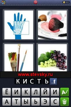 4 фото 1 слово ответы уровень 153: 1. Рука, рентгеновский снимок 2. Пудреница с кисточкой 3. Набор кистей для рисования и покраски 4. Две грозди винограда: зелёного и чёрного 5 букв Правильный ответ - КИСТЬ |