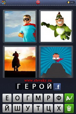 4 фото 1 слово ответы уровень 178: 1. Мальчик в костюме супермена 2. Нарисованный человечек в зелёном костюме и маске 3. Силуэт всадника на фоне заката 4. Мультяшный супермен на горе 5 букв Правильный ответ - ГЕРОЙ |