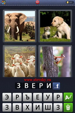 4 фото 1 слово ответы уровень 201: 1. Слон, слоны 2. Котёнок и щенок 3. Овцы, бараны 4. Белка на дереве 5 букв Правильный ответ - ЗВЕРИ |