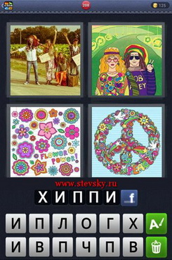 4 фото 1 слово ответы уровень 208: 1. Четверо голосуют на дороге, один держит гитару, у других - плакаты 2. Пара в странных нарядах, у мужчины на голове растаманская шапка, а на груди написано Bob Marley 3. Узоры из цветов, написано Flower Power 4. Символ мира из цветов и узоров 5 букв Правильный ответ - ХИППИ |