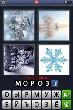 4 фото 1 слово ответы уровень 209: 1. Листья в инее 2. Зимний пейзаж: дерево, озеро подо льдом 3. Автомобильная шина в снегу 4. Снежинка 5 букв Правильный ответ - МОРОЗ |