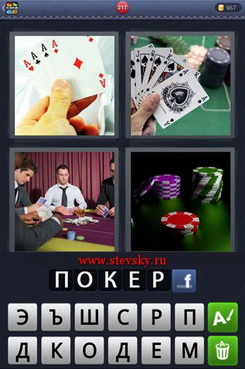 4 фото 1 слово ответы уровень 217: 1. Четыре туза 2. Стол с фишками казино, в руке - пять карт пиковой масти, по порядку от десятки до туза 3. Игроки за карточным столом 4. Фишки игорного заведения, казино 5 букв Правильный ответ - ПОКЕР |