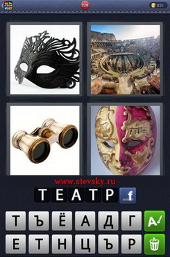 4 фото 1 слово ответы уровень 228: 1. Чёрная маска 2. Колизей изнутри 3. Бинокль 4. Венецианская маска, половина золотая, половина розовая 5 букв Правильный ответ - ТЕАТР |