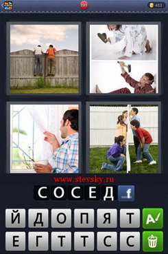 4 фото 1 слово ответы уровень 231: 1. Двое заглядывают за забор 2. Девушка стучит по полу тапком, мужчина стучит по потолку молотком 3. Мужчина стоит у окна с кржкой в руках и смотрит во двор 4. Дети столпились по обе стороны забора 5 букв Правильный ответ - СОСЕД |