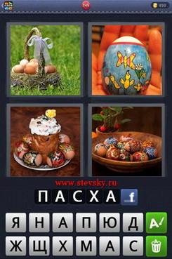 4 фото 1 слово ответы уровень 245: 1. Яйца в корзинке 2. Разукрашенное яйцо 3. Кулич, разрисованные яйца 4. Тарелка с разноцветными узорчатыми яйцами 5 букв Правильный ответ - ПАСХА |