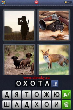 4 фото 1 слово ответы уровень 247: 1. Человек с биноклем 2. Ружьё, рожок 3. Таксы на лесной тропинке 4. Лиса 5 букв Правильный ответ - ОХОТА |