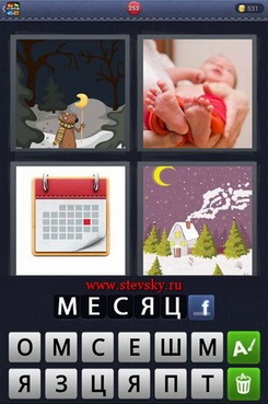 4 фото 1 слово ответы уровень 253: 1. Рисунок: волк с палкой в лапе 2. Младенец, ноги 3. Календарь с одним отмеченным красным днём 4. Рисунок: зима, ёлки, дом, дым из трубы, полумесяц 5 букв Правильный ответ - МЕСЯЦ |