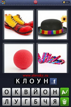 4 фото 1 слово ответы уровень 254: 1. Жёлтые ботинки с вытянутыми красными носами 2. Шляпа-котелок с разноцветной окантовкой и цветком 3. Красный шарик 4. Разноцветная лента со звёздочками 5 букв Правильный ответ - КЛОУН |