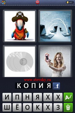 4 фото 1 слово ответы уровень 262: 1. Попугай в пиратской треуголке 2. Ноутбуки обмениваются информацией 3. Три CD-диска 4. Девушка фотографирует себя на мобильник 5 букв Правильный ответ - КОПИЯ |