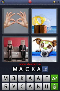 4 фото 1 слово ответы уровень 271: 1. Две руки изображают глаза 2. Маска для подводного плавания 3. Два человека с картонными коробками на головах сидят на диване 4. Собака с дольками огурцов на морде 5 букв Правильный ответ - МАСКА |