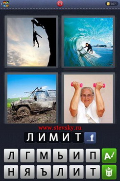 4 фото 1 слово ответы уровень 272: 1. Скалолазы забираются на отвесный склон, один висит, держась одной рукой за руку второго 2. Виндсёрфер мчится под волной 3. Внедорожник едет по грязи 4. Бабушка поднимает маленькие розовые гантели 5 букв Правильный ответ - ЛИМИТ |
