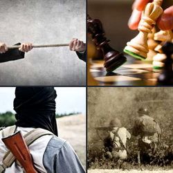 4 фото 1 слово ответы уровень 308: 1. Двое перетягивают канат, верёвку 2. Шахматы, белая фигура опрокидывает чёрную 3. Спина человека с замотанной чёрной тканью головой, приклад автомата 4. Двое солдат на поле, старое фото 5 букв Правильный ответ - ВОЙНА |