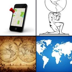 4 фото 1 слово ответы уровень 330: 1. Айфон, в который воткнута красная кнопка-гвоздик 2. Атлант держит на плечах земной шар 3. Атлас двух полушарий 4. Карта мира 5 букв Правильный ответ - АТЛАС |