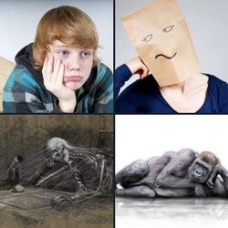 4 фото 1 слово ответы уровень 399: 1. Рыжий парень положил голову на руку 2. Человек в бумажном пакете (одел бумажный пакет на голову) 3. Скелет за письменным столом 4. Горилла лежит, отдыхает 5 букв Правильный ответ - СКУКА |