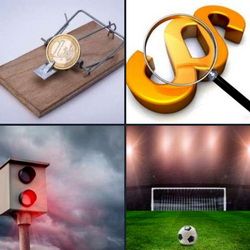 4 фото 1 слово ответы уровень 409: 1. Мышеловка с 1 евро внутри 2. Знак параграф (§) под лупой 3. Семафор горит красным светом 4. Футбольный мяч и пустые ворота 5 букв Правильный ответ - ШТРАФ |