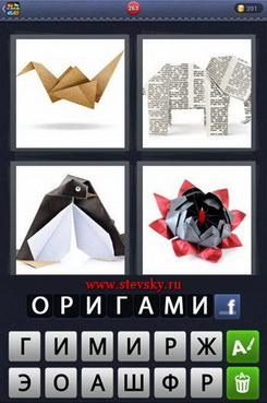 4 фото 1 слово ответы уровень 263: 1. Журавлик из бумаги 2. Слон из газеты 3. Два пингвина из бумаги 4. Искусственный цветок 7 букв Правильный ответ - ОРИГАМИ |