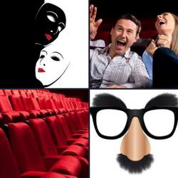 4 фото 1 слово ответы уровень 376: 1. Две маски: чёрная и белая на чёрно-белом фоне 2. Двое смеются 3. Ряд кресел в кинотеатре 4. Маска: очки с бровями, нос и усы 7 букв Правильный ответ - КОМЕДИЯ |