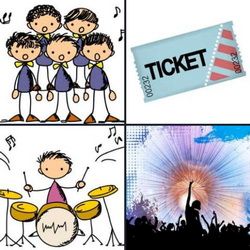 4 фото 1 слово ответы уровень 378: 1. Нарисованные дети поют 2. Билет с надписью Ticket 3. Нарисованный человек играет на барабанной установке 4. Толпа людей, из которой одна девушка высоко тянет руку 7 букв Правильный ответ - КОНЦЕРТ |