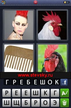 4 фото 1 слово ответы уровень 048: 1. Девушка с красными волосами и тату на плече 2. Петух 3. Расчёска 4. Снова петух 8 букв Правильный ответ - ГРЕБЕШОК |