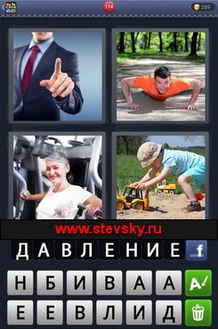 4 фото 1 слово ответы уровень 114: 1. Мужчина указывает пальцем в камеру 2. Парень отжимается на дороге 3. Женщина на тренажере 4. Мальчик играет с машинками в песочнице 8 букв Правильный ответ - ДАВЛЕНИЕ |